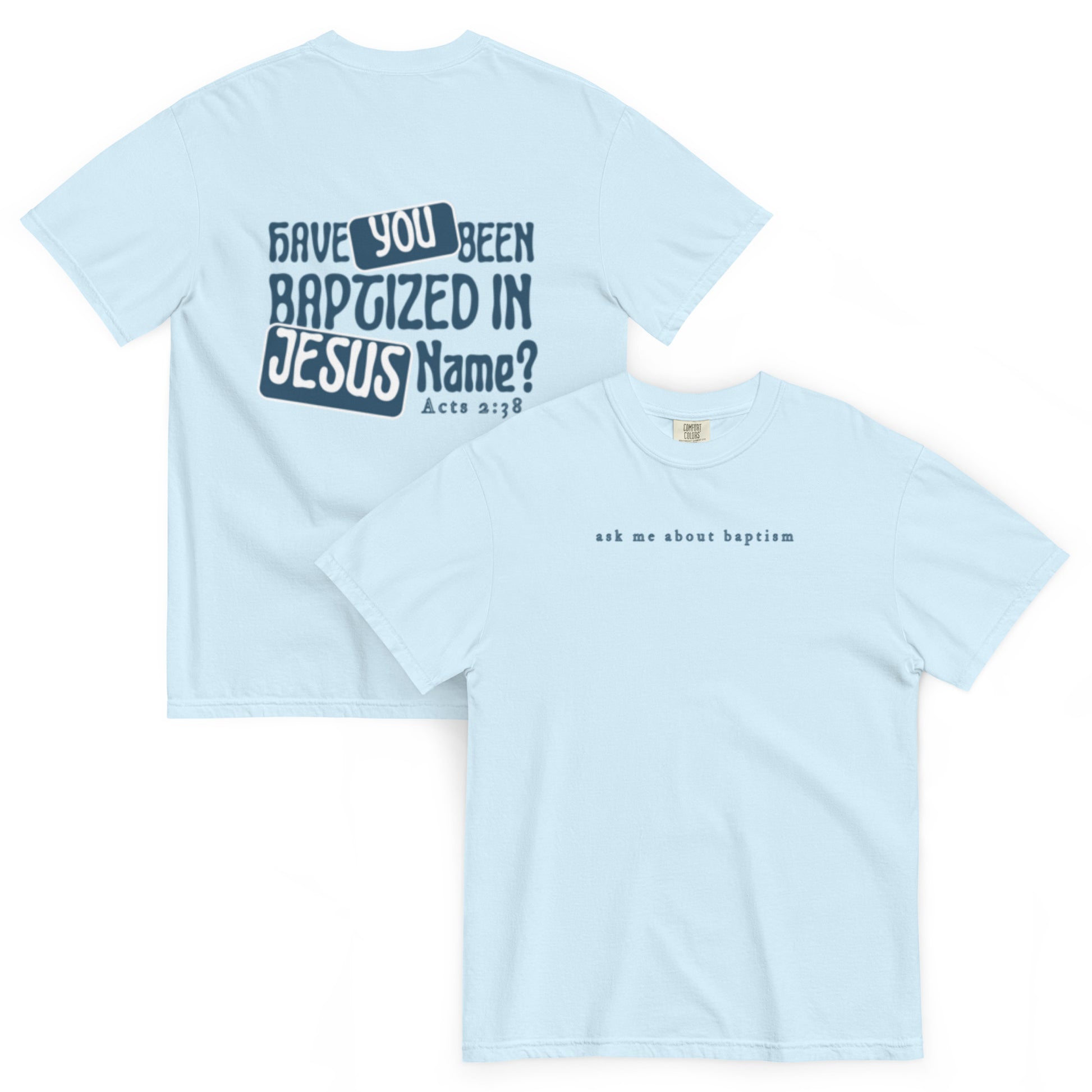Spark meaningful conversations and share your faith with this Apostolic evangelical t-shirt designed for outreach-minded individuals. On the front, the clear and inviting message — "Ask Me About Baptism" — opens the door for life-changing dialogue. On the back, the direct and powerful question — "Have You Been Baptized in Jesus' Name?" — reflects the heart of Acts 2:38 and the Apostolic call to truth.
